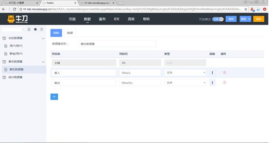 在数据制作区,某个数据集的“结构”选项卡中,显示“列名称”和“类型”两列。进入开发模式后,多显示一列:“列标识”,如图13-3所示。“列名称”用于制作,在属性栏中显示列名称。“列标识”用于开发,在代码中使用列标识访问列。