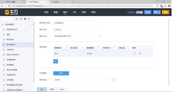 服务制作区就是制作服务的地方。一个服务由2个文件组成,分别是服务描述文件(service.m)和逻辑文件(java)。在java文件中,服务是java类,请求是java方法。进入开发模式后,除保留制作功能外,还增加了这2种文件的编辑区。因此,在请求详情的下方显示3个按钮,用于切换设计区和代码编辑区,如图13-4所示。