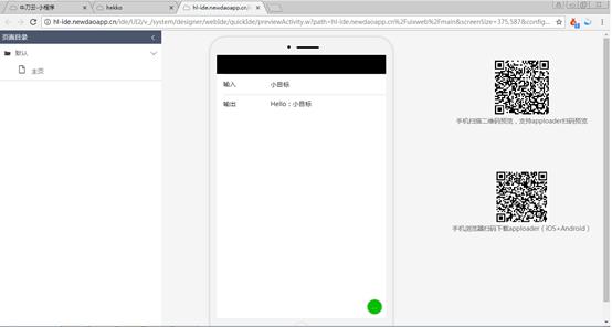 单击“预览”按钮显示运行页面。在输入框中输入“小目标”,用鼠标在页面上空白的地方单击,使得输入框中的焦点移出,文本组件中显示“Hello:小目标”。