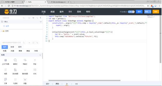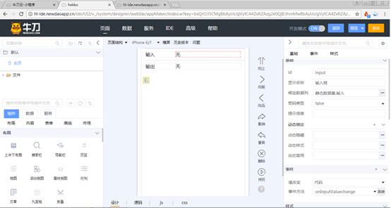 从表13-1中可以看出,用户输入的内容存入静态数据集的输入列,文本组件显示输出列的内容。那么,在哪里格式化输入列的内容,存入输出列呢?可以在输入框组件的“值改变”事件中,从事件参数event中获得输入框中的内容,在前面加上“Hello:”,然后写入输出列。