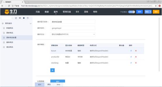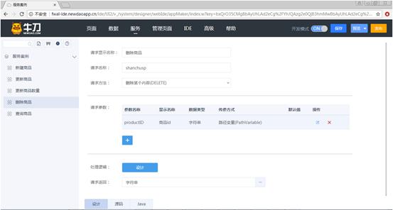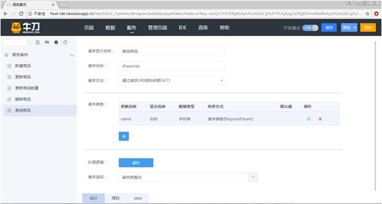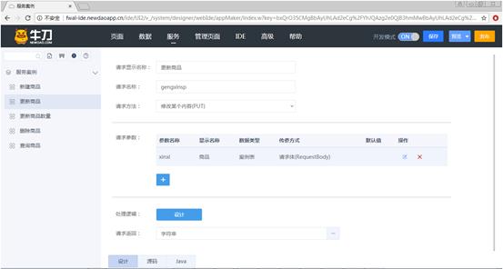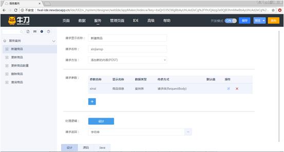 手写JAVA代码的方法是:在请求详情页面中,单击“写代码”按钮,切换到JAVA编辑器,这里显示出服务的JAVA文件,在其中找到和请求名称同名的方法,就是请求对应的处理逻辑方法,进行编辑即可。