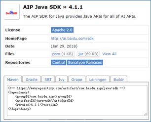 在服务制作区中,添加服务“身份证识别”。从中央仓库找到百度AI SDK的Maven参数,如图15-15所示。在“身份证识别”服务上“设置依赖”,“组名称”填入com.baidu.aip,“名称”填入java-sdk,版本号填入4.1.1。