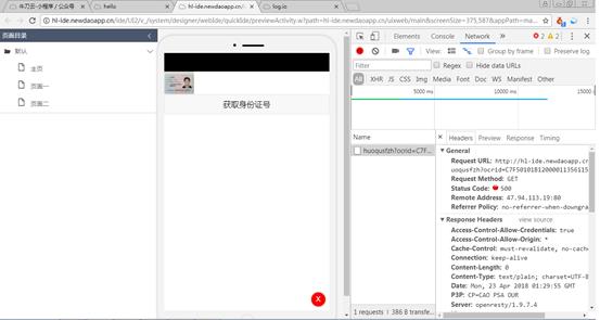从上面的步骤中可以看出,需要在JAVA代码中实现的是第三步,将img转化为idcardID。在写JAVA代码之前,可以先添加页面,看看运行效果。现在调用“获取身份证号”请求虽然不会获得身份证号,但是可以获得正面照片列中的值,看看JSON数组的内容,如图15-18所示。