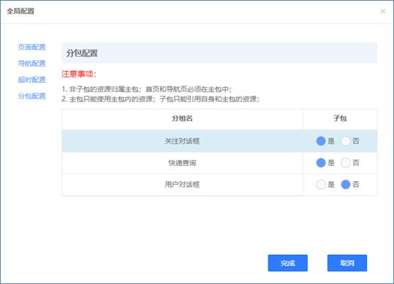 这里列出了除默认分组以外的全部页面分组,默认分组中的页面会生成到主包中,其它分组如果希望生成为子包,就选中“是”,否则选中“否”。子包不限个数,一个分组对应生成一个子包。