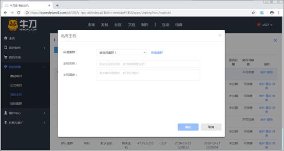 在“我的主机”中添加私有主机。方法是:选择左侧功能树中的“我的主机”菜单命令,打开“牛刀云-我的主机”页面。单击“私有主机”按钮,打开“私有主机”对话框。如图18-11所示。