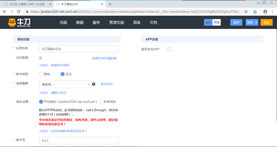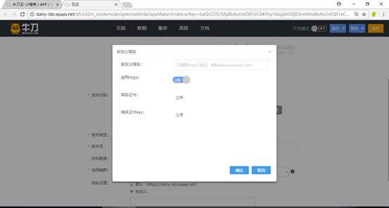 “域名设置”选择“默认”表示使用牛刀云提供的域名,如果要使用自己的域名,请选择“自定义”,在弹出的“自定义域名”对话框(如图18-14所示)中,输入自定义域名(不需要带https://),选中“启用https”选项开关,显示出“域名证书”和“域名证书key”的上传按钮。选择本地证书和key文件上传。