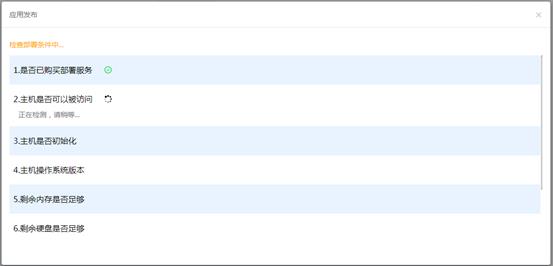 应用发布时,牛刀会先自动检查部署条件是否满足。检查内容包括:是否购买了部署服务、主机连接是否正常、是否已初始化、操作系统版本是否可用、剩余内存和硬盘是否足够、docket和端口占用情况检查。当部署条件检查出现异常,会在界面上给出提示,按提示进行处理即可。如图18-16所示主机连接异常提示。