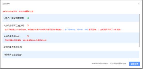 出现检查异常时显示红色提示,按提示内容进行确认和处理后,点击右下角按钮“重新检查”,检查条件都通过自动进入部署日志输出界面。