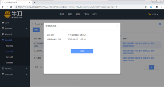 发布完成后,打开“制作中心”→“我的部署”→“正式项目”菜单命令,进入“牛刀云-正式项目”页面,显示正式发布的项目记录。单击“查看部署服务”按钮,可查询部署服务截止日期,如图18-16a所示.