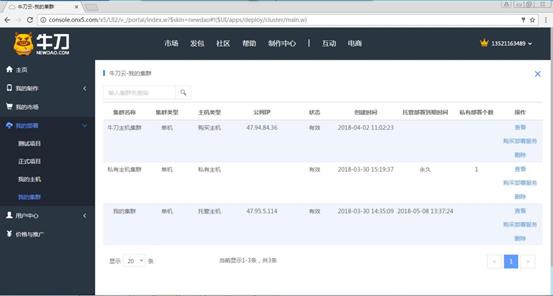 购买部署服务费的方法是:选择“制作中心”→“我的部署”→“我的集群”菜单命令,打开“牛刀云-我的集群”页面,显示我的集群记录。如图19-11所示。