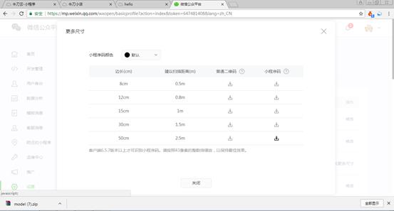 单击“下载更多尺寸”按钮,打开更多尺寸对话框,如图20-15所示,提供多种颜色和尺寸的小程序码用于下载。