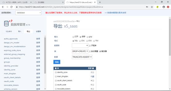 其中“输出”选择“保存”,“格式”选择SQL,“数据”选择TRUNCATE+INSERT,取消选中表的“全选”复选框,取消选中数据的“全选”复选框,只选中需要导出数据的表的数据复选框(表名右侧的复选框),单击“导出”按钮,,生成并下载SQL文件。